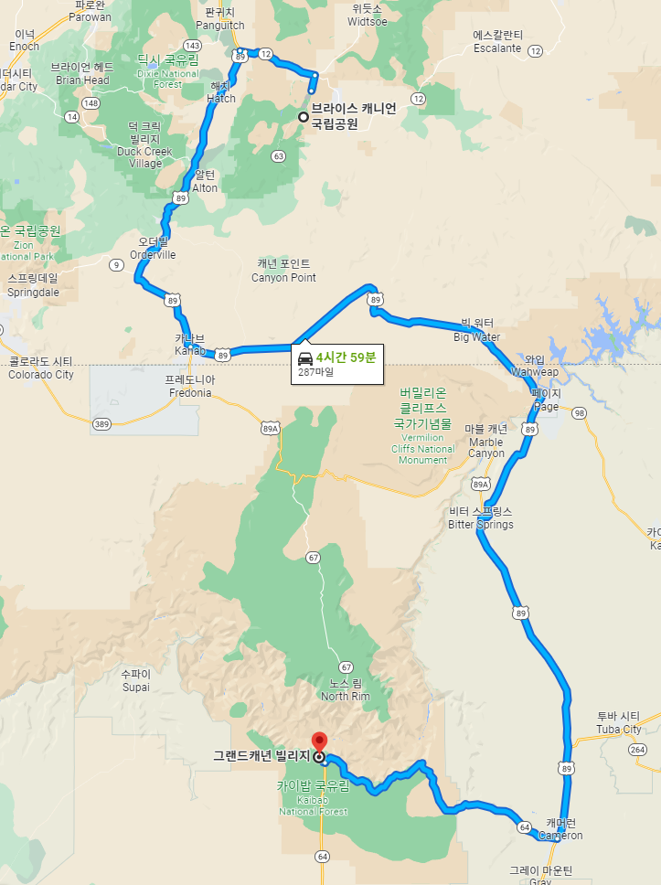예를 들어보겠습니다. 미국의 브라이스 캐년 국립공원에서 그랜드 캐년 빌리지까지 여행을 한다고 생각해 봅시다. 그럼 경로에 출발지 브라이스캐년, 도착지 그랜드캐년 넣고 경로를 검색하겠죠? 그럼 아래와 같은 경로로 표시를 해 줍니다.