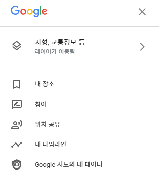 접속을 하면 현재 위치가 표시되기도 하고, 이전에 구글 지도 접속 기록이 있으면 마지막으로 본 지도가 열리기도 합니다. 다른 것은 필요없고 왼쪽 상단의 메뉴를 확인하세요.