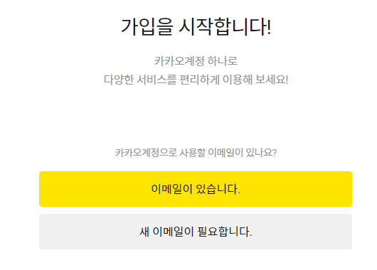 카카오 가입을 시작하려고 하면 2개의 옵션을 물어본다. 하나는 이메일이 이미 있는지, 아니면 새로운 이메일이 필요한지 여부.